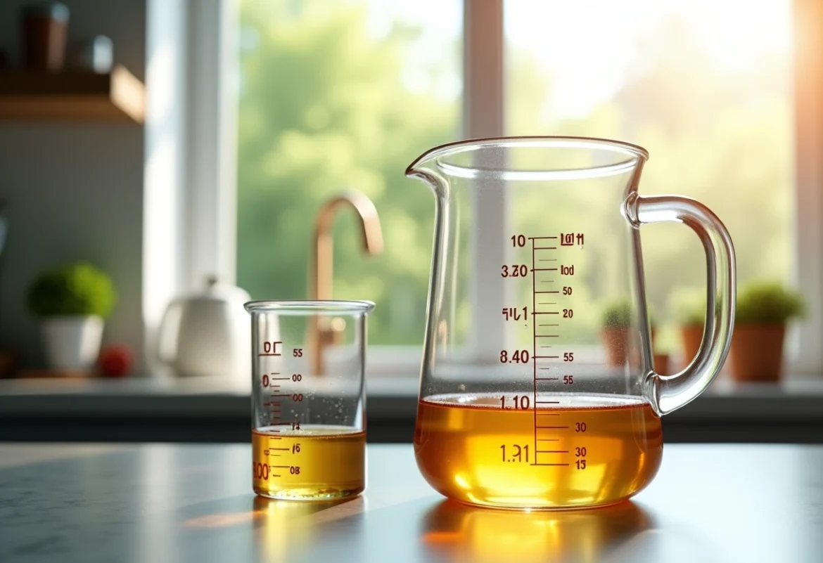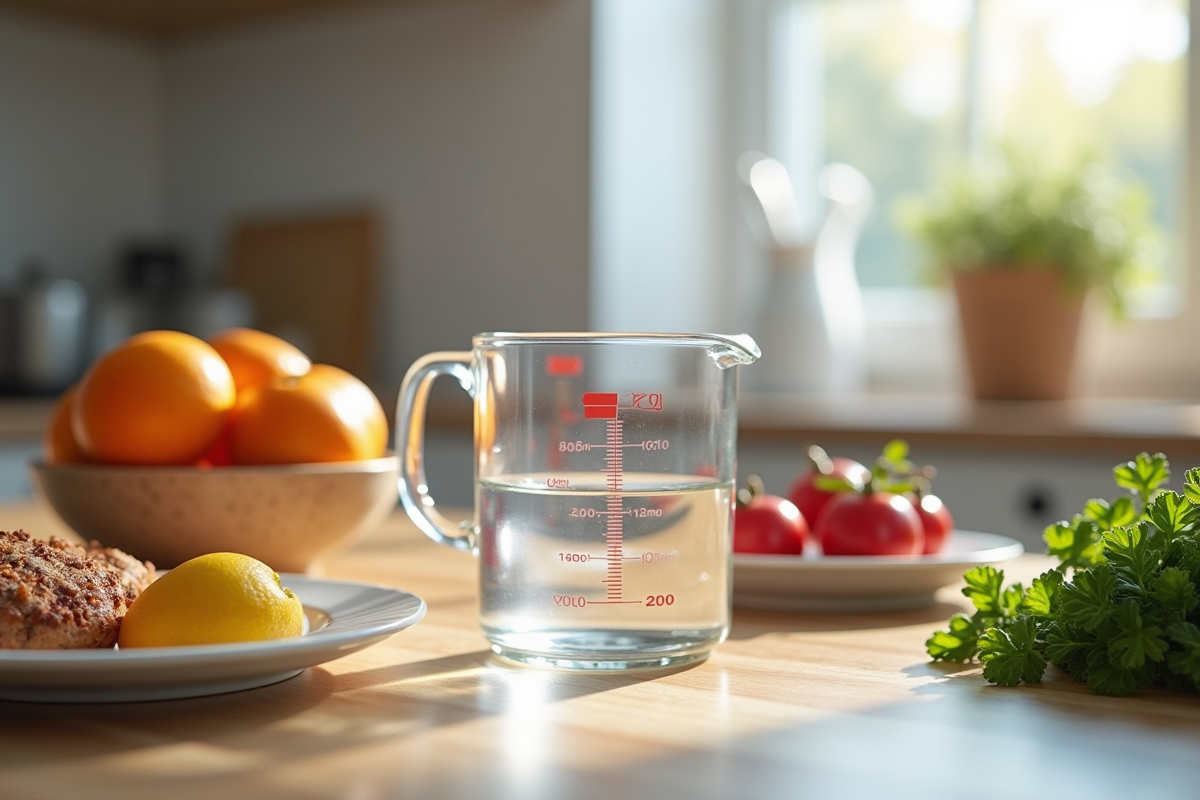 Verre mesureur rempli à 800 ml sur plan de cuisine lumineux